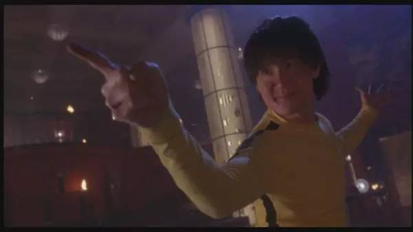 张学友模仿李小龙虽是搞笑成分居多,但这个装模作样、贪生怕死的“龙威”最后还是使出了真功夫,不但与周比利打得天翻地覆,更拳脚神鞭双截棍齐出,最后还来个肘击解决大BOSS。张学友本非打星,电影里却将猛龙仿得神形皆备,实在难得。