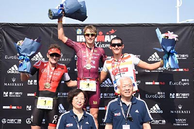11月13日,男子组冠军澳大利亚选手乔希·安贝格(上中)、亚军英国选手蒂姆·唐(上左)和季军美国选手贾斯廷·梅茨勒(上右)在颁奖仪式上。当日,2016厦门世界铁人三项赛暨铁人世锦赛资格赛厦门站比赛在厦门国际会展中心附近海域和环岛路上举行,吸引了全球57个国家和地区的2179名选手参赛。
